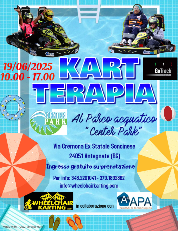 Anche quest’anno, per il terzo anno di fila, saremo presenti al parco acquatico “Center Park” per una giornata di Kart-Terapia!!! Per partecipare all’evento è OBBLIGATORIA